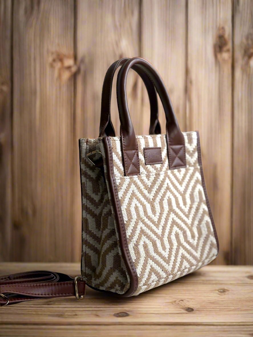 - Intricate Jacquard Fabric: The bag features a beige and white zigzag pattern jacquard cotton cloth, providing a sophisticated and textured appearance.