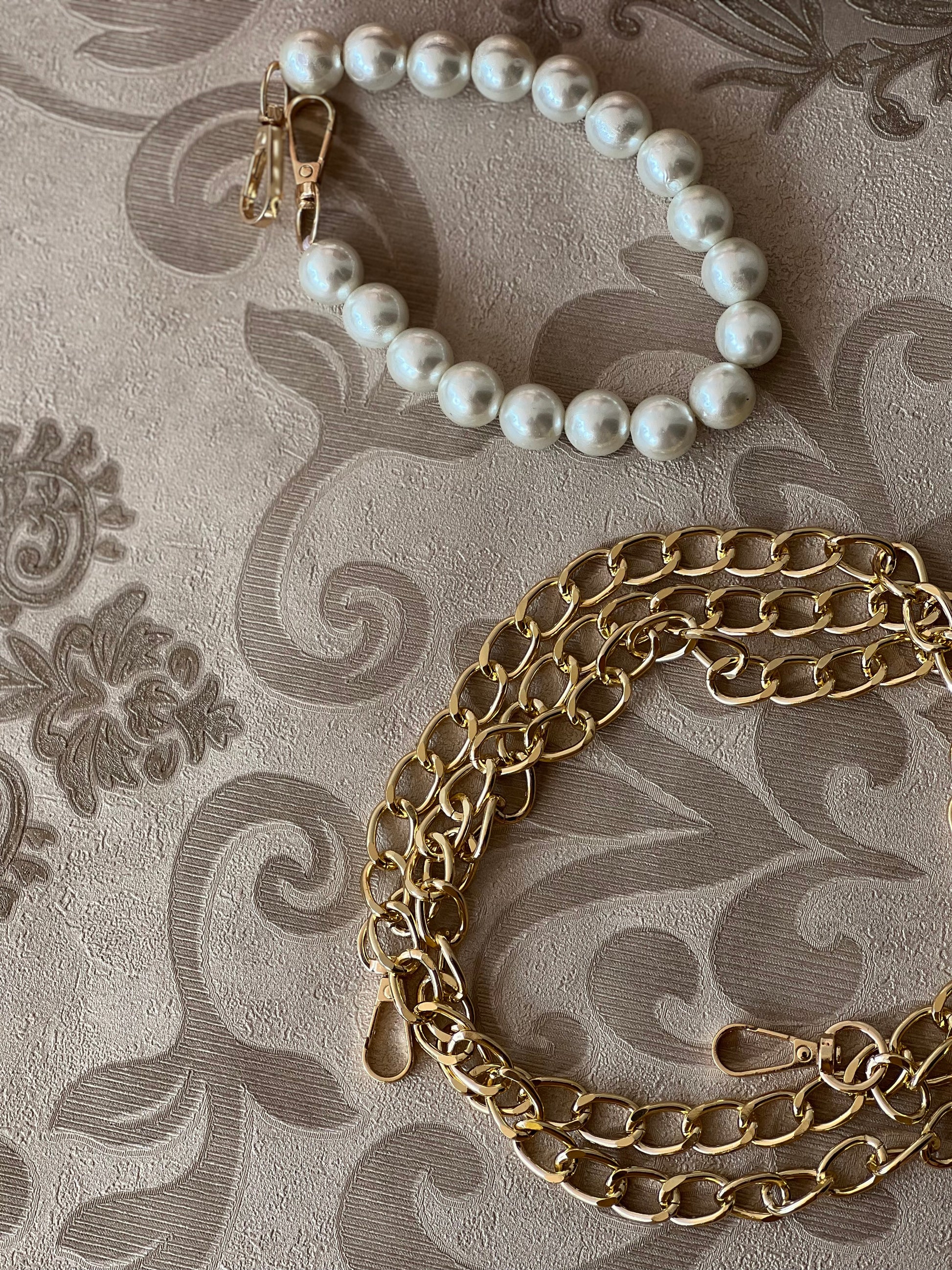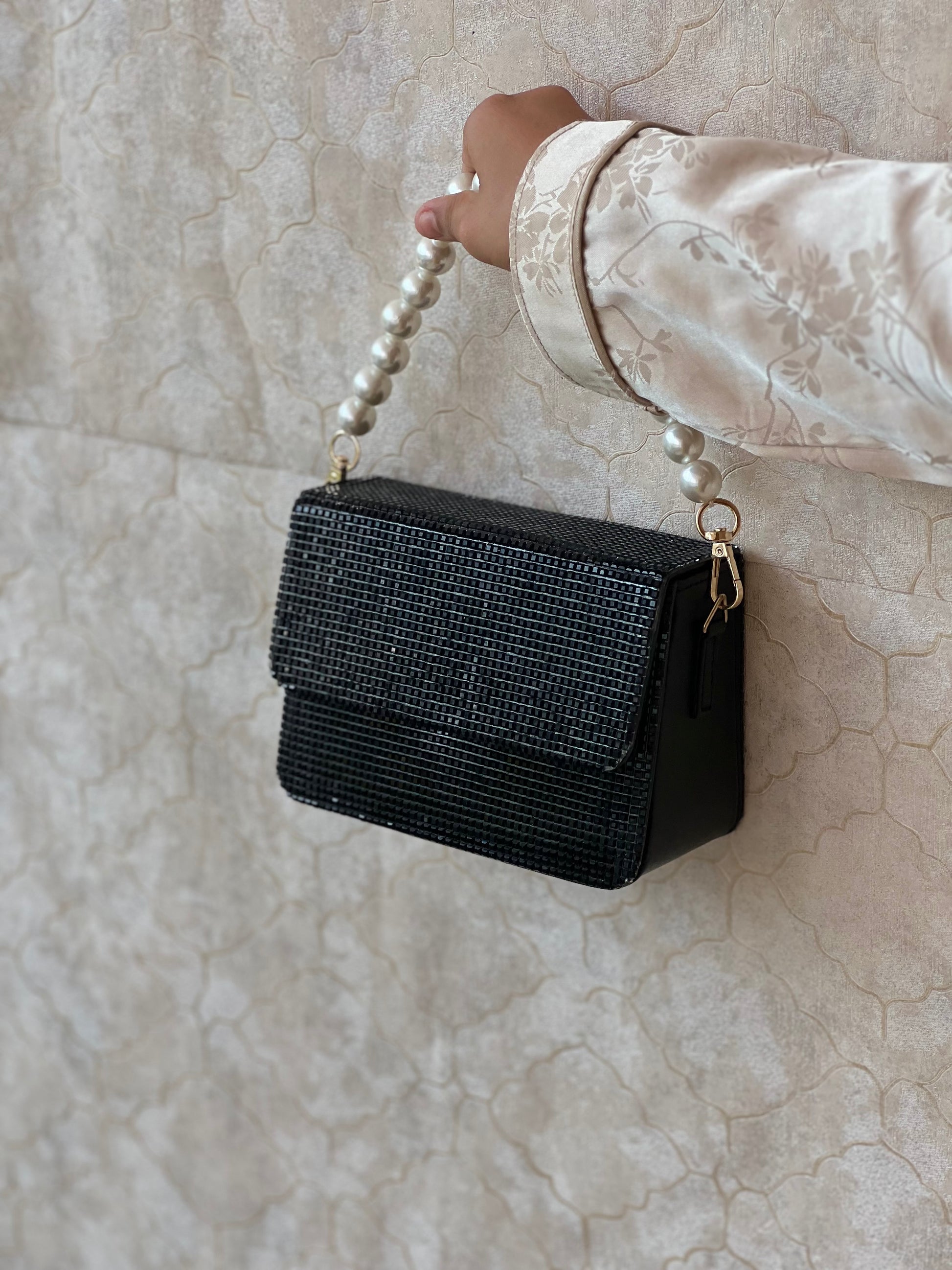 The combination of a detachable pearl handle, golden chain shoulder strap, shiny black finish, and rhinestones makes the Bling Sling Bag a truly unique and eye-catching accessory.