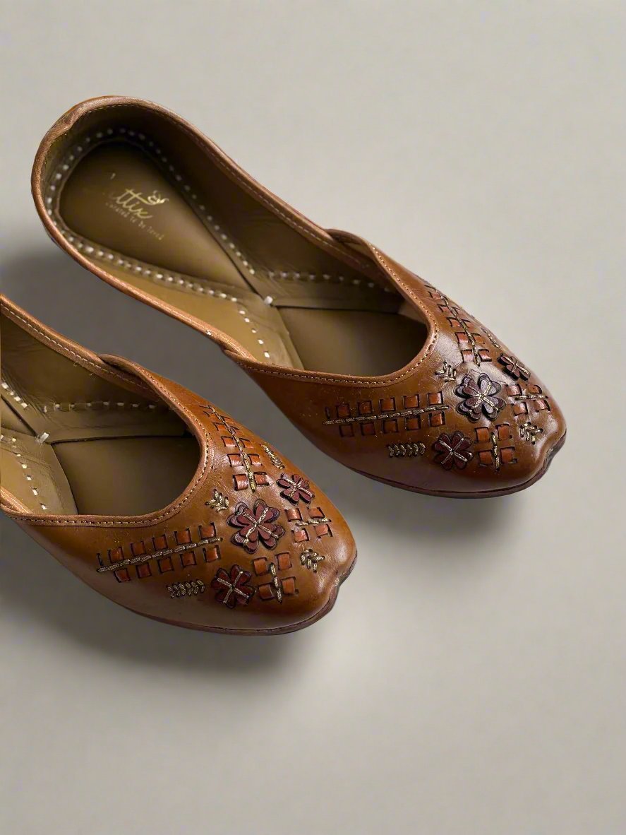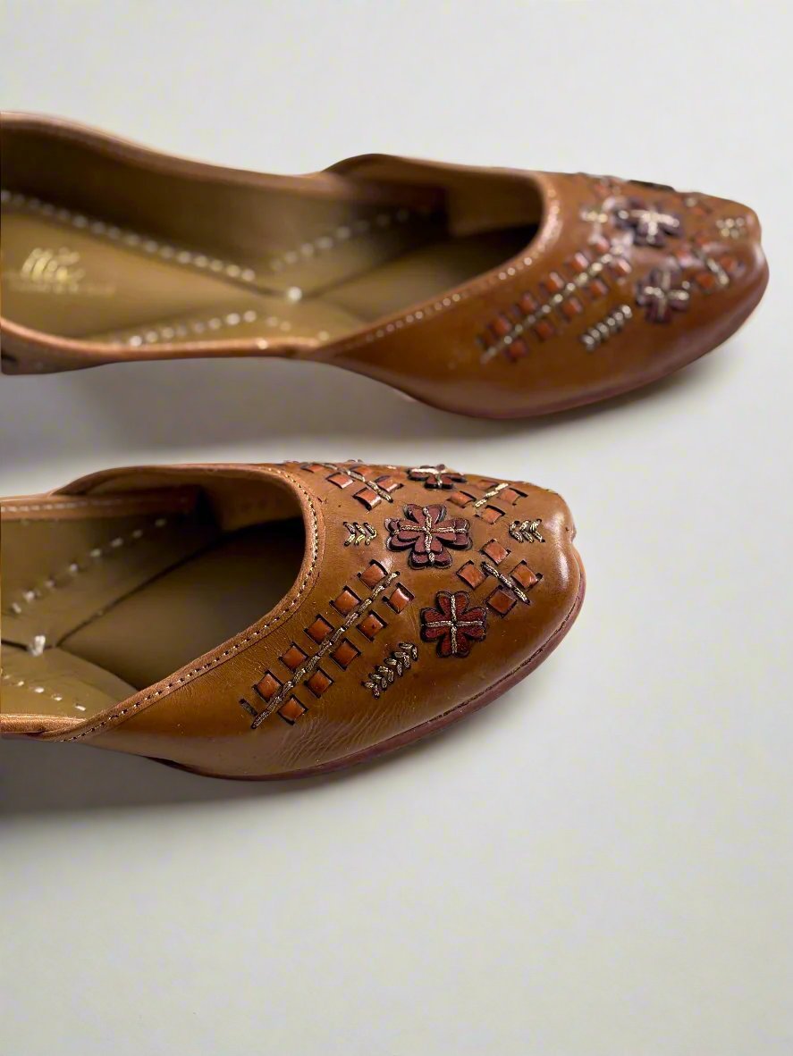 - Upper Material: Caramel-colored leather with intricate antique zari embroidery and pater work