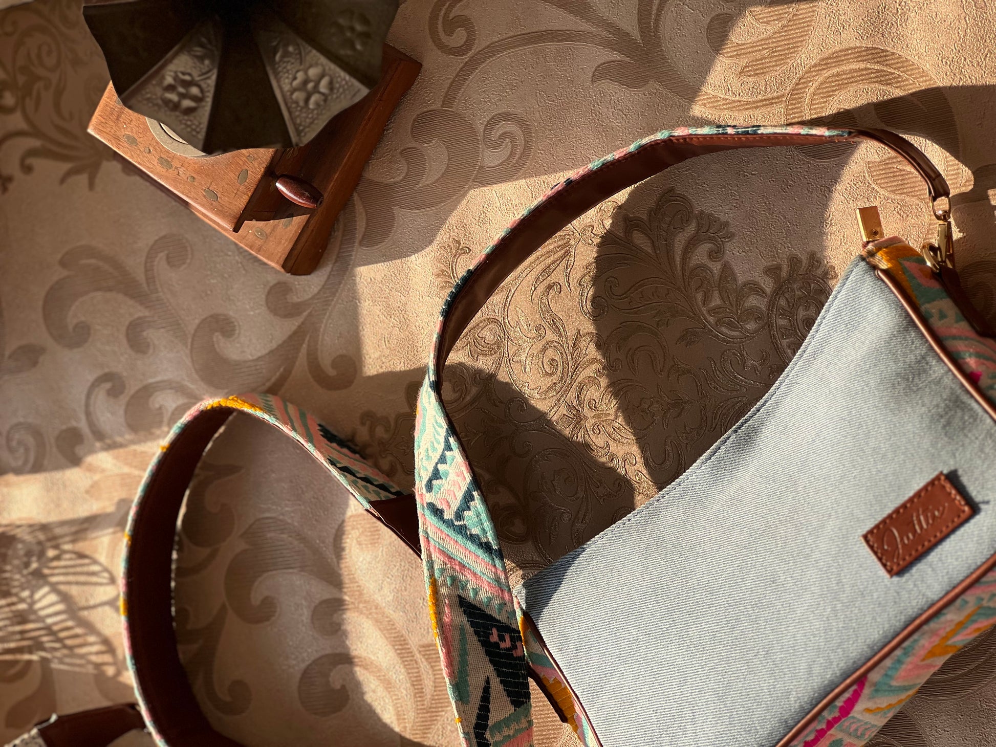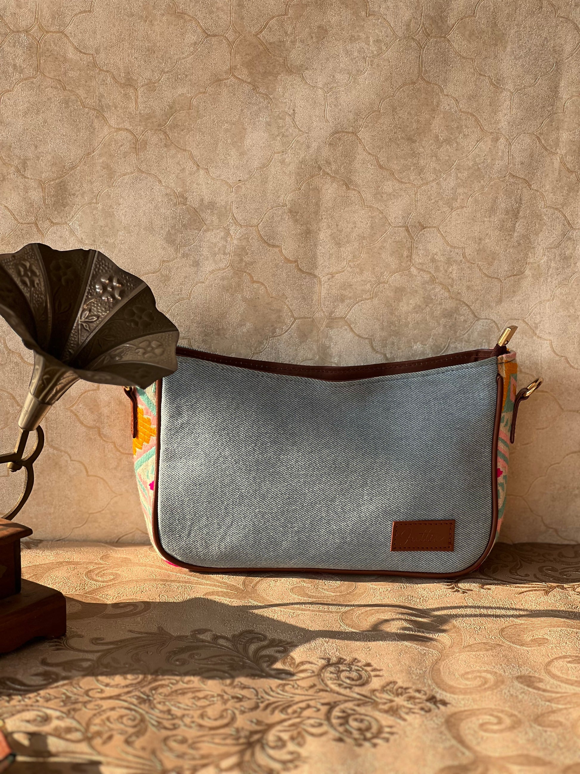 The unique combination of denim, jacquard cotton cloth, and faux leather, along with the broad strap, sets this sling bag apart from others in terms of both aesthetics and durability.