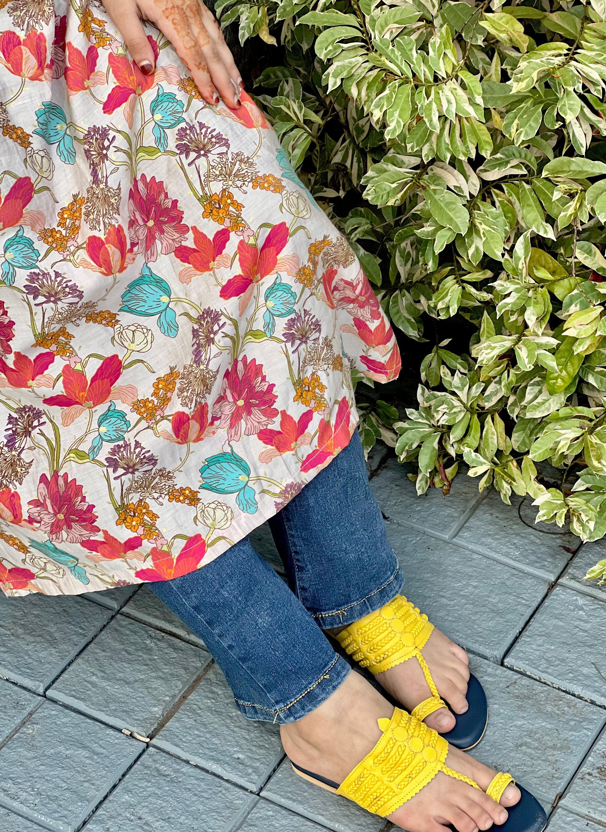 Each pair of Isha Kolhapuris is handcrafted with meticulous attention to detail, showcasing the intricate Kolhapuri handiwork on the yellow braided straps. The slight variations in design and color ensure a unique and personalized touch, making each pair truly one-of-a-kind.