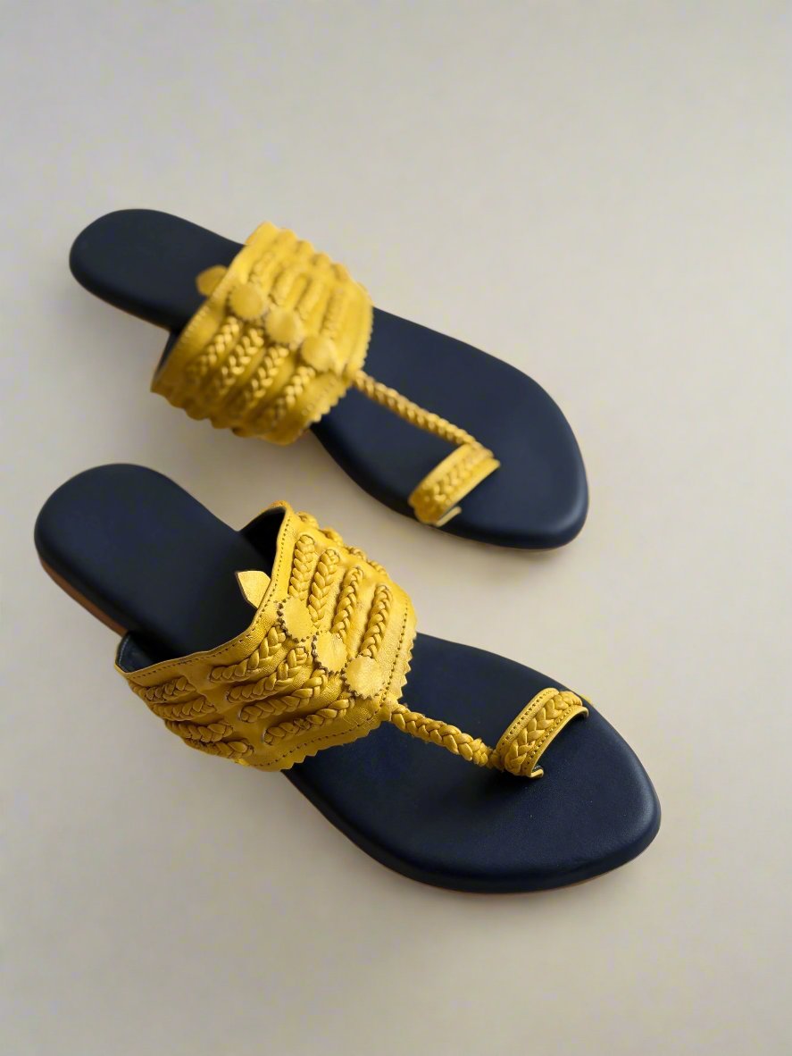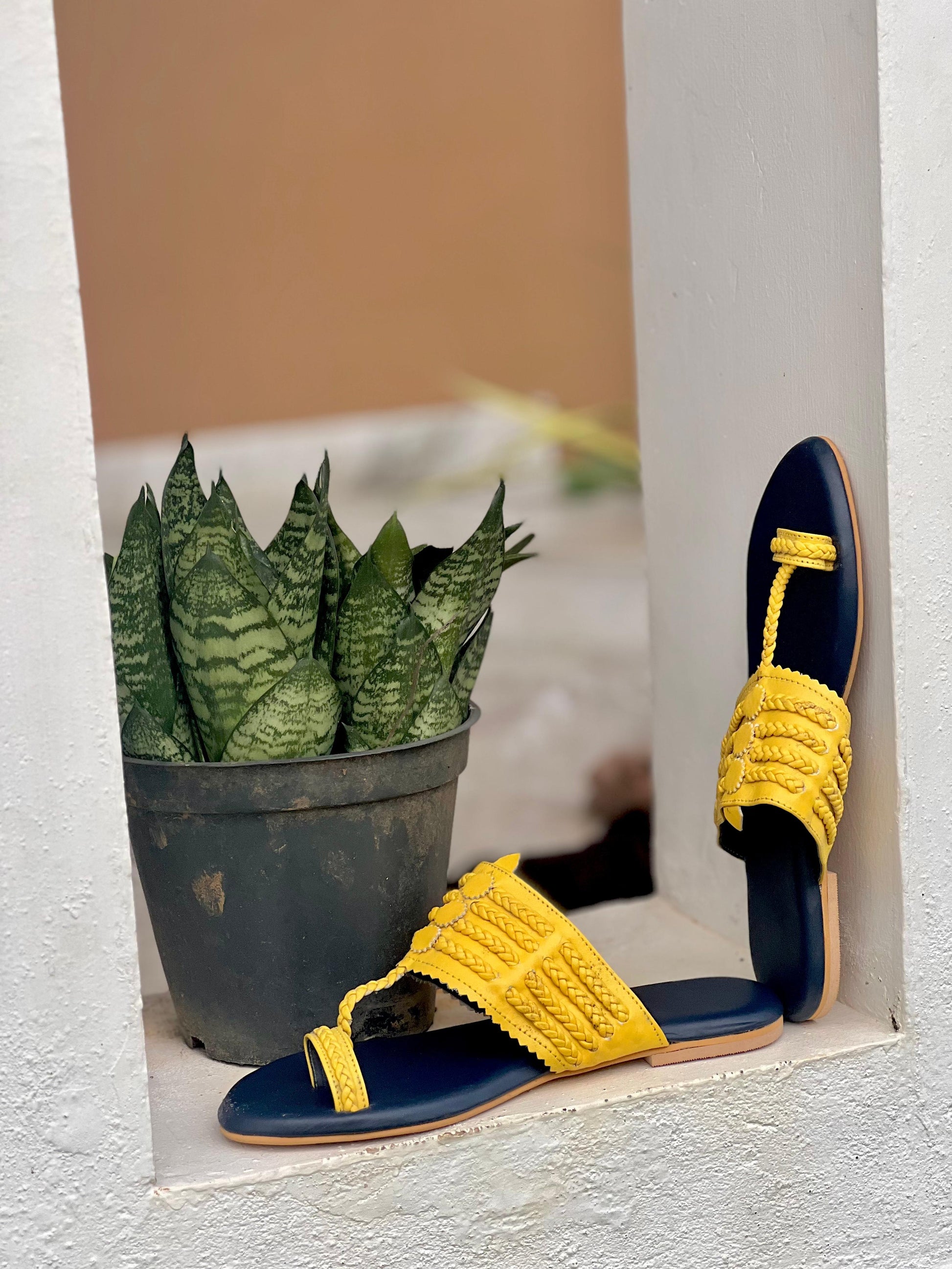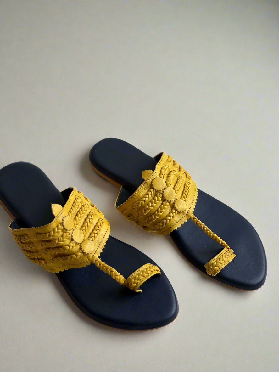 The Isha Kolhapuris are fully handcrafted footwear, featuring a dark blue faux leather base with vibrant yellow braided straps. These sandals blend traditional craftsmanship with contemporary design, offering a unique and stylish look. The base is made of high-quality faux leather, ensuring durability and comfort. The yellow straps add a striking contrast, enhancing the overall aesthetic. Each pair is handmade with love and care by various artisans, resulting in slight differences in design and color that give each pair a one-of-a-kind aesthetic. Designed with a double-cushioned footbed for extra comfort, they are perfect for all-day wear. Ideal for special occasions, casual outings, traditional events, everyday wear, and adding a unique twist to any outfit, the Isha Kolhapuris combine comfort, durability, and artistic charm.