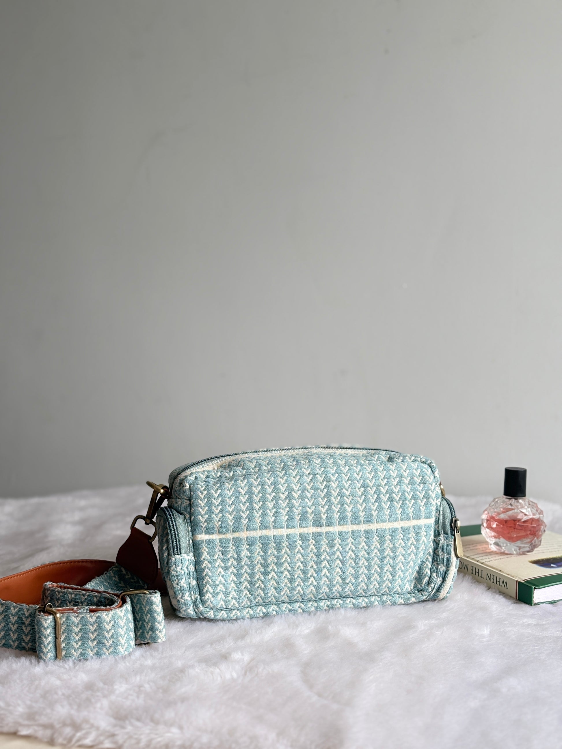 - Color & Design: Soft sky blue with geometric motifs; contrast tan leather detailing for a touch of elegance.