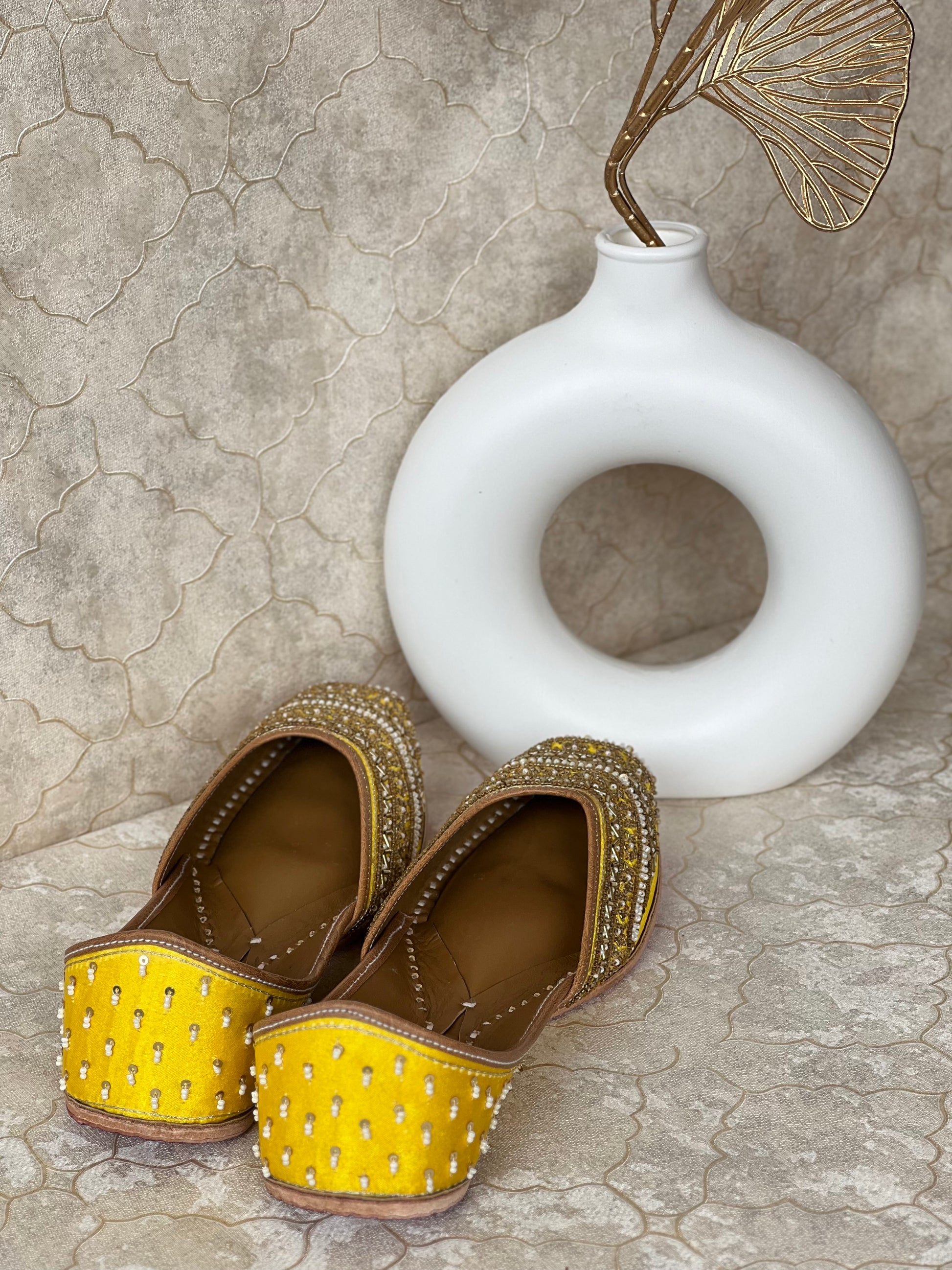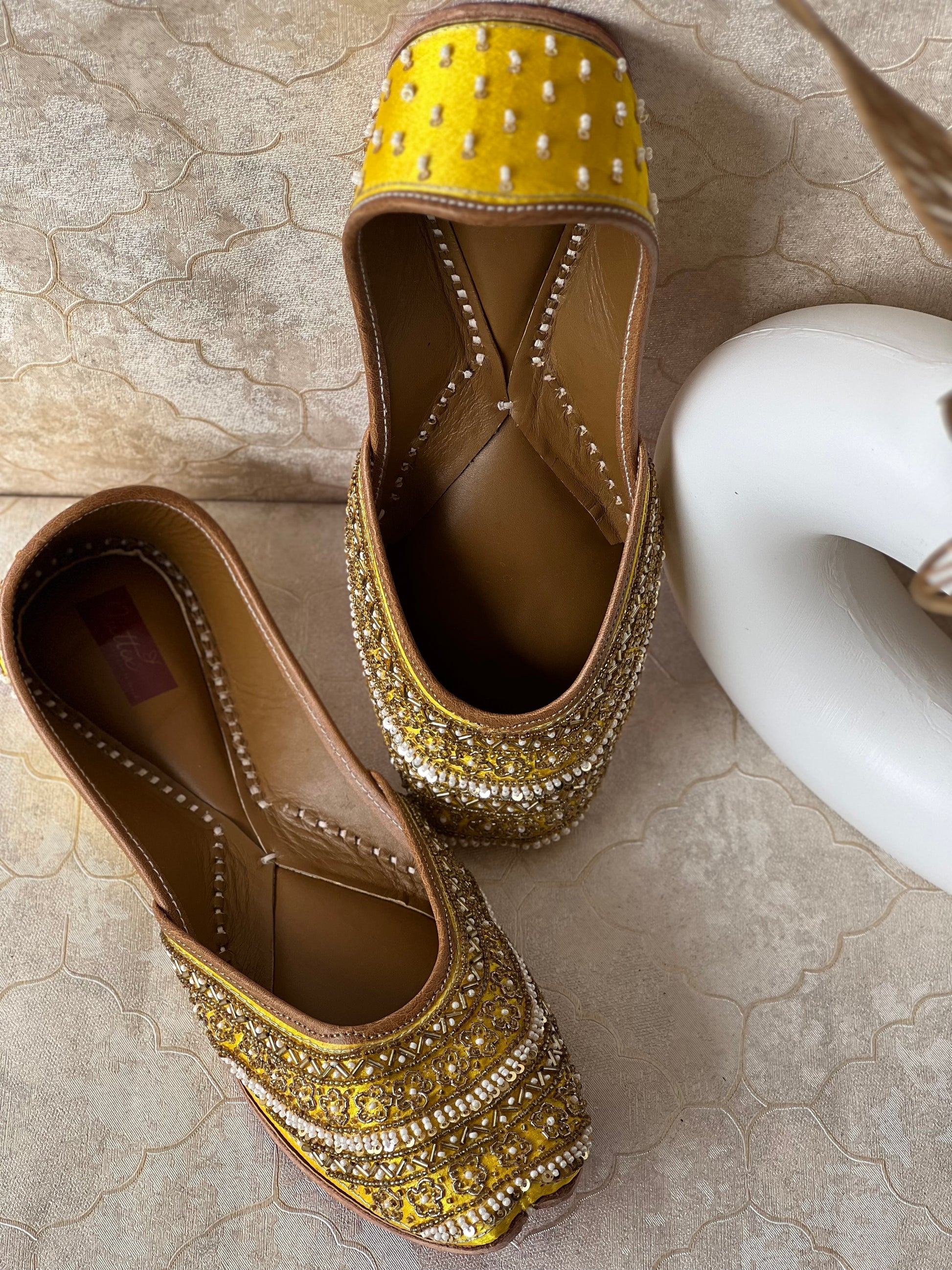 The unique, eye-catching design of the Kiara Juttis combines a vibrant yellow fabric with intricate golden dabka embroidery and white pearls, creating a stunning, exotic aura.
