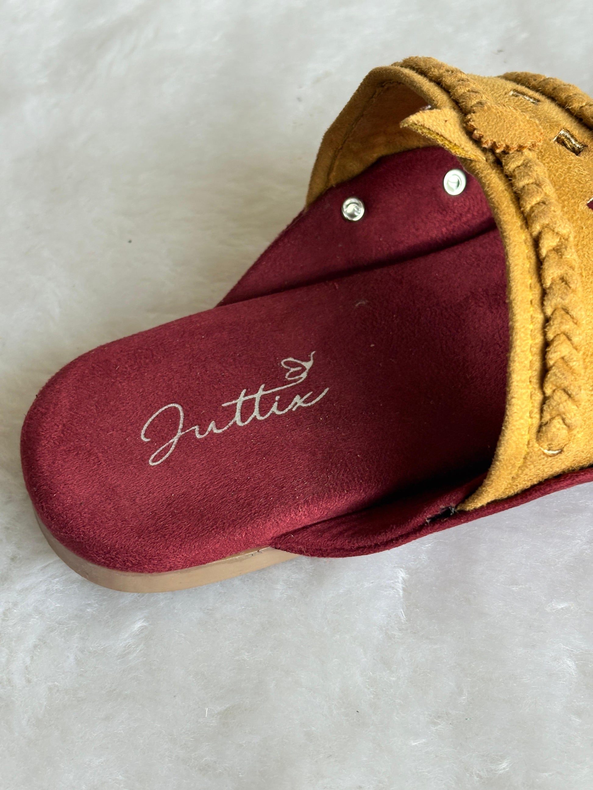 - Footbed: Soft suede maroon base for all-day comfort.
