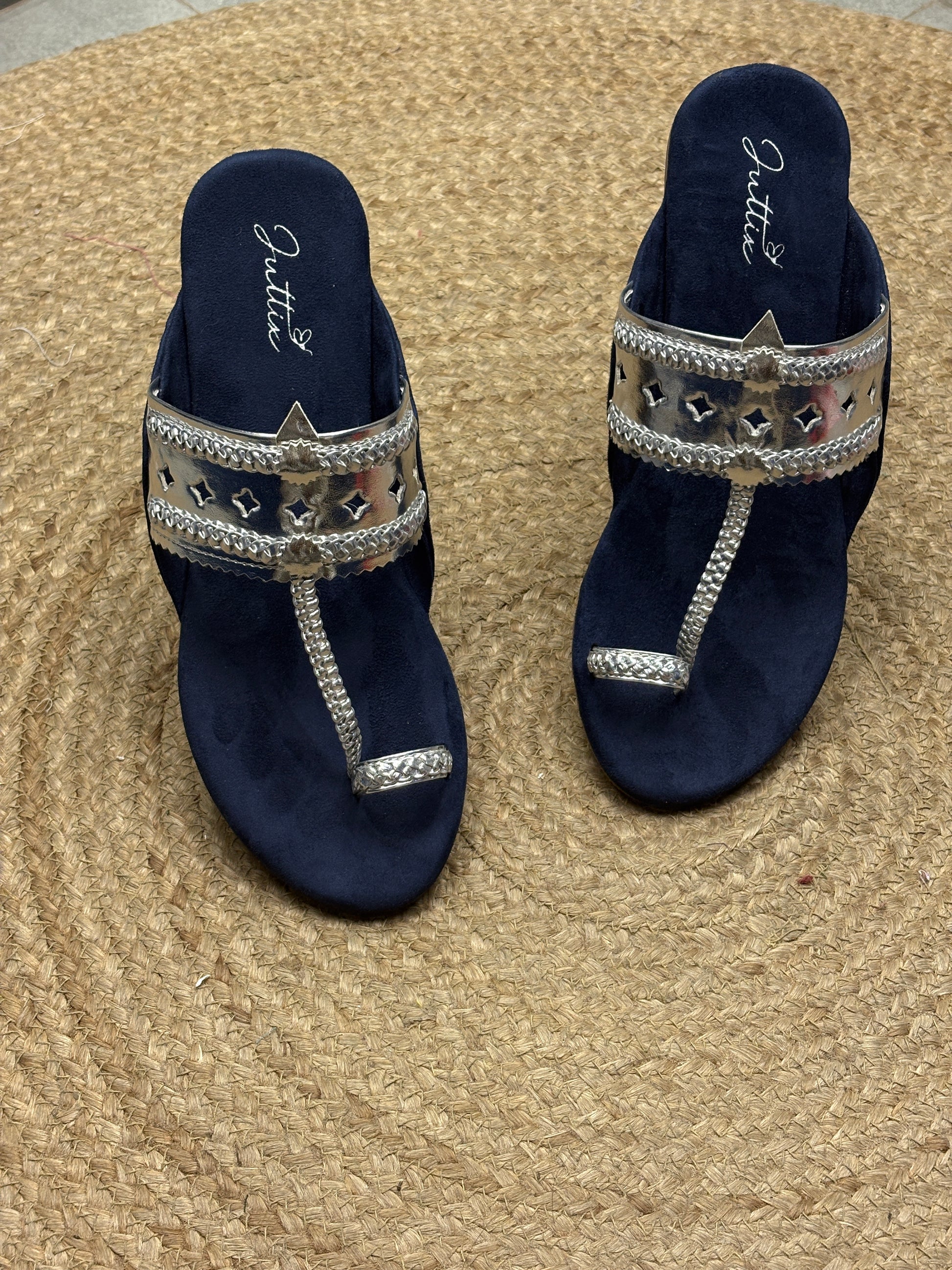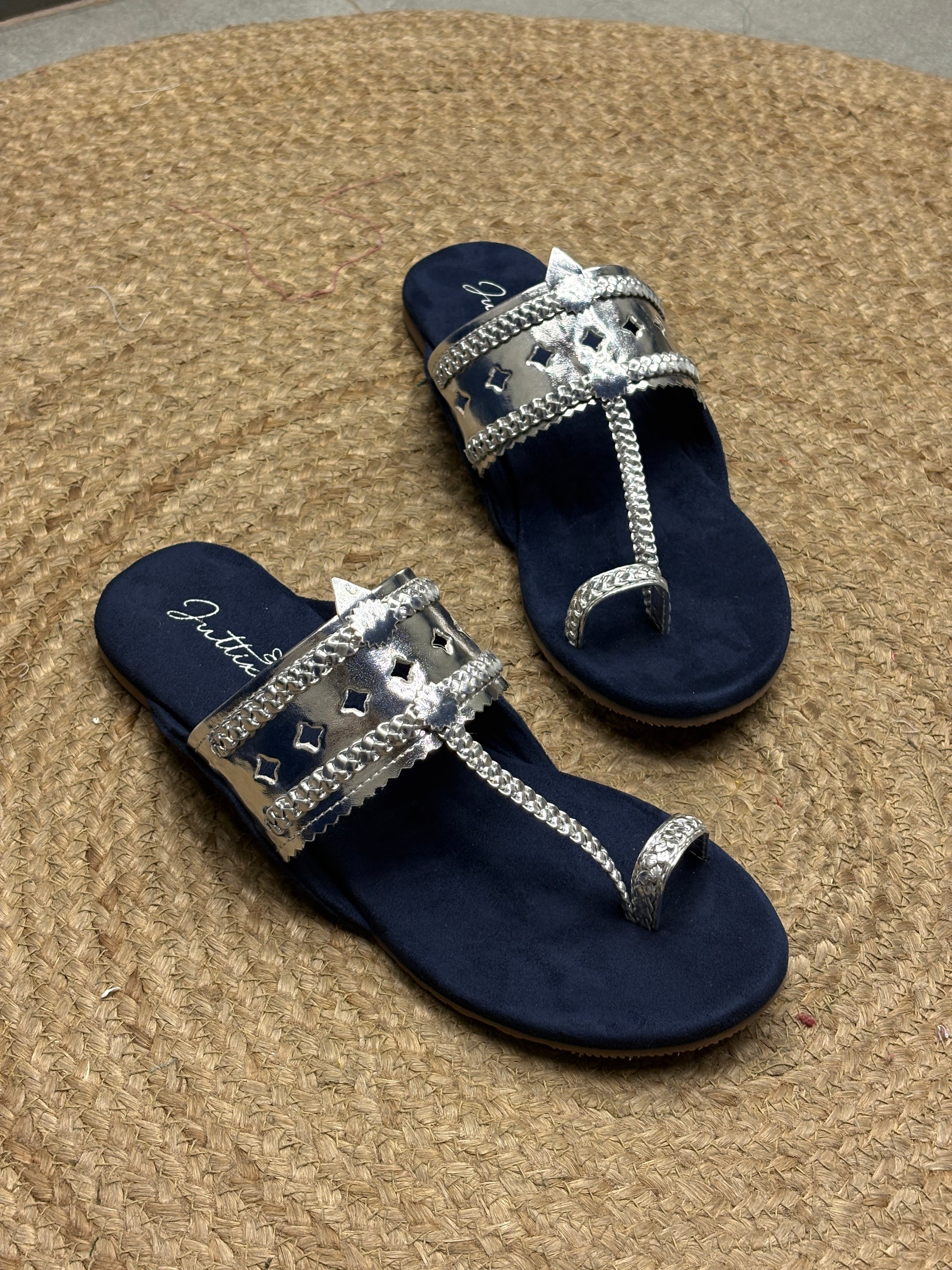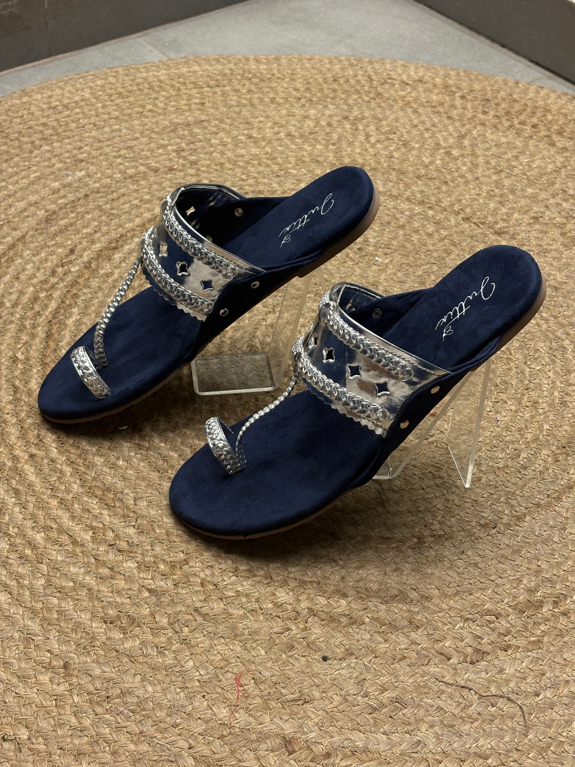 The Nakshatra Kolhapuris are a radiant blend of tradition and glamour, designed to make every step feel celestial. With a deep suede blue footbed and shimmering silver rexin straps, these flats exude festive charm and refined craftsmanship. The upper features intricate metallic detailing and braided accents, creating a visual symphony of texture and shine. Whether you're dressing for a celebration or elevating your everyday ensemble, these Kolhapuris offer unmatched comfort and standout style