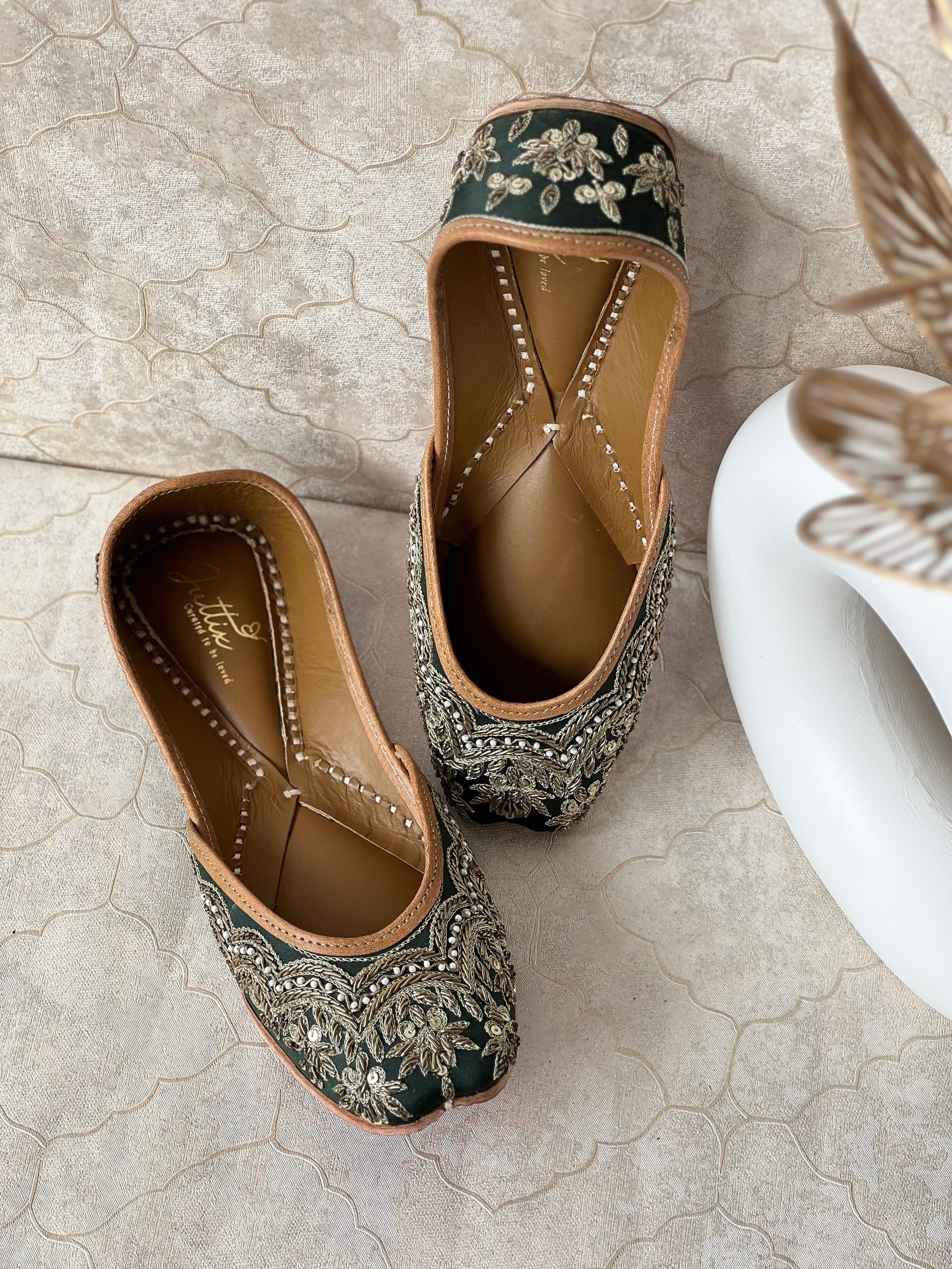 The Santa Juttis are a perfect embodiment of elegance and tradition. With a stunning gold-toned floral embroidery on a deep emerald green base, these juttis are designed to make a statement. The gold-toned zari and dabka embroidery work in dual gold tones add a rich texture and opulence, making them ideal for bridal looks or festive occasions. The intricate craftsmanship on the upper material is complemented by genuine leather inner and outer materials that provide both durability and comfort. The double-cushioned sole ensures enhanced comfort for long hours of wear. The comfortable inner lining, featuring a brown base with white dotted stitching, ensures a snug fit for extended wear.
