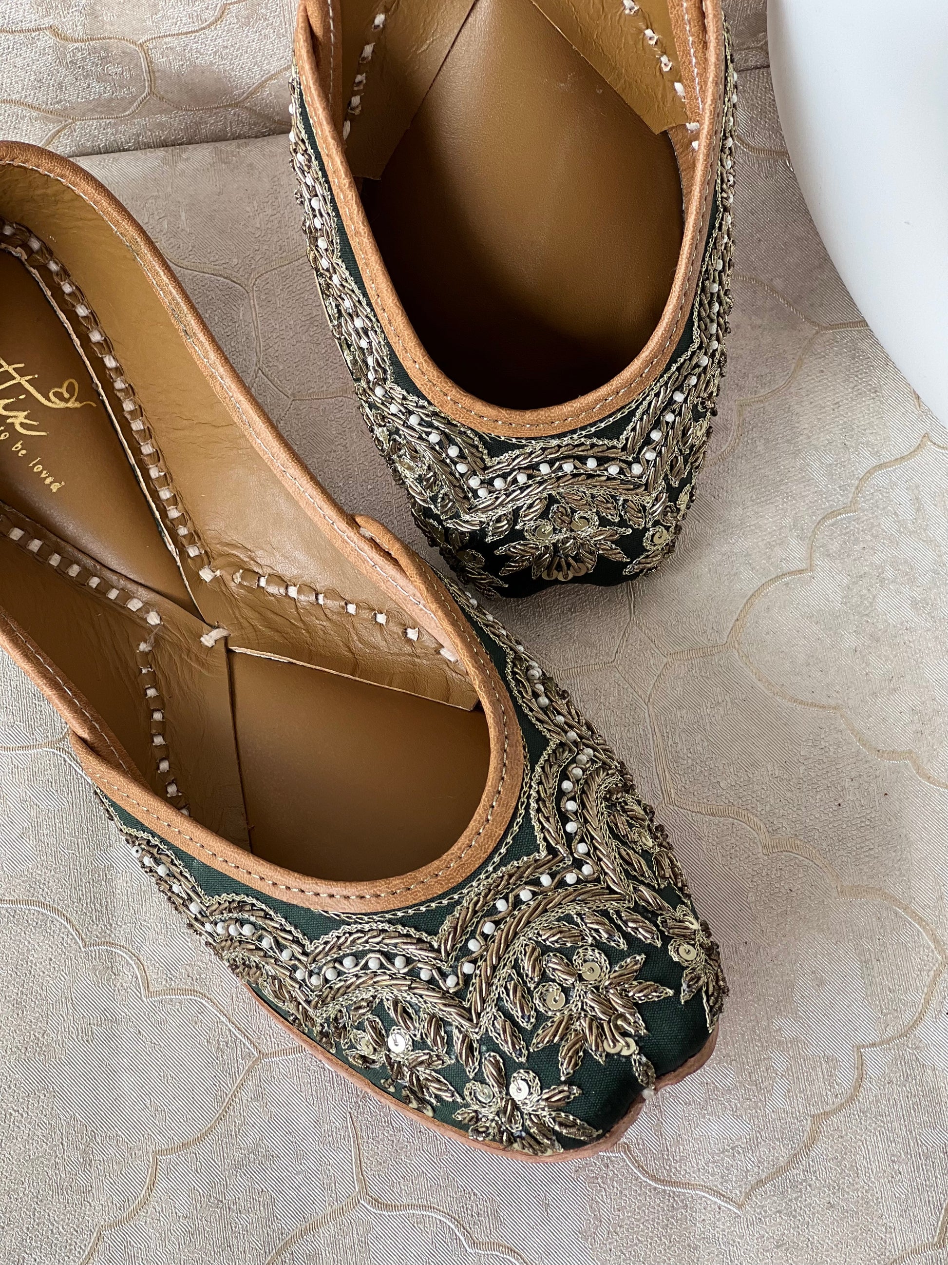 - Upper Material: Deep emerald green base with stunning gold-toned floral zari and dabka embroidery