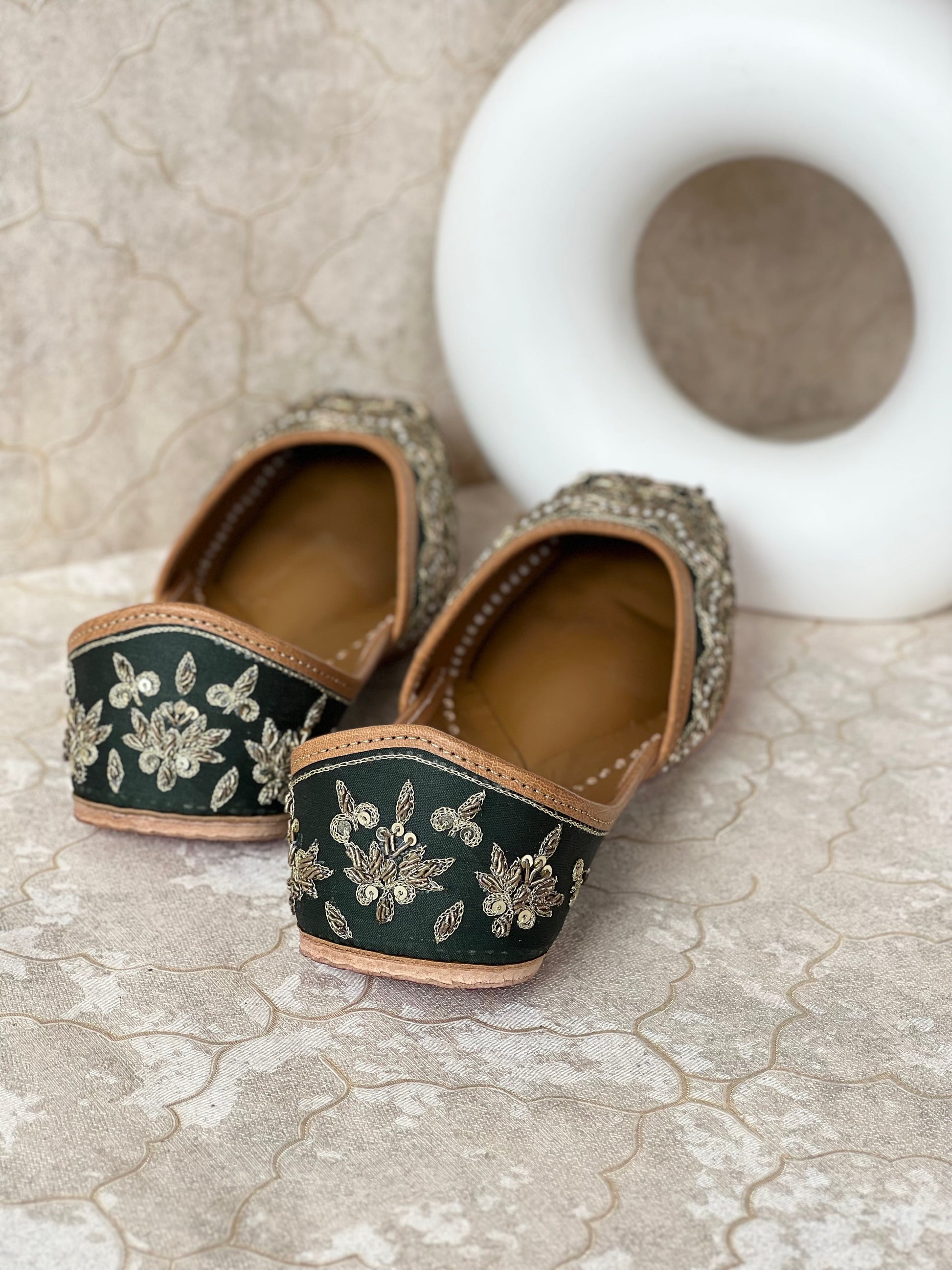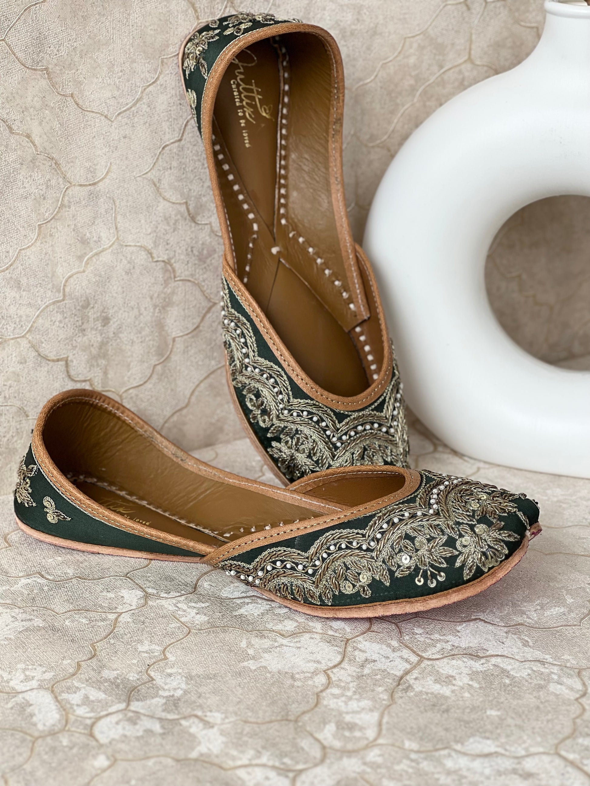 The unique combination of a deep emerald green base and dual gold-toned zari and dabka embroidery gives these juttis a regal and timeless appeal. The intricate floral pattern showcases exceptional craftsmanship, making these juttis a true work of art.