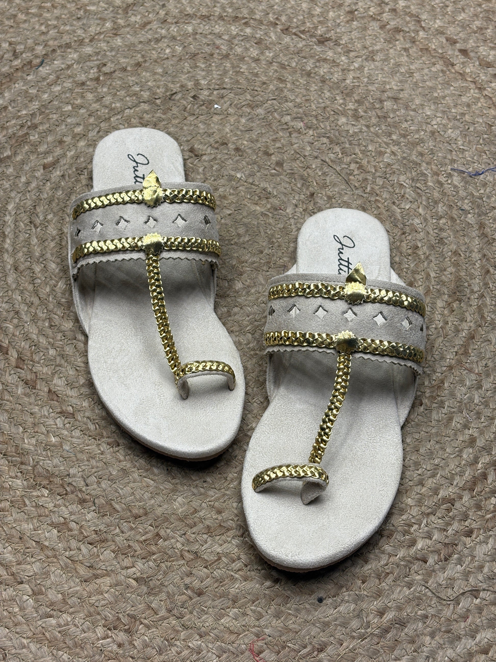 Graceful and radiant, the Tara Kolhapuris are a celebration of understated luxury and traditional artistry. Set on a soft suede off-white footbed, these flats feature delicately braided golden accents woven into matching suede straps. The design is elevated with subtle metallic embellishments that shimmer with every step, making them perfect for both festive occasions and refined everyday wear. Their vibrant off-white and gold palette adds a touch of opulence while maintaining a versatile, earthy tone.