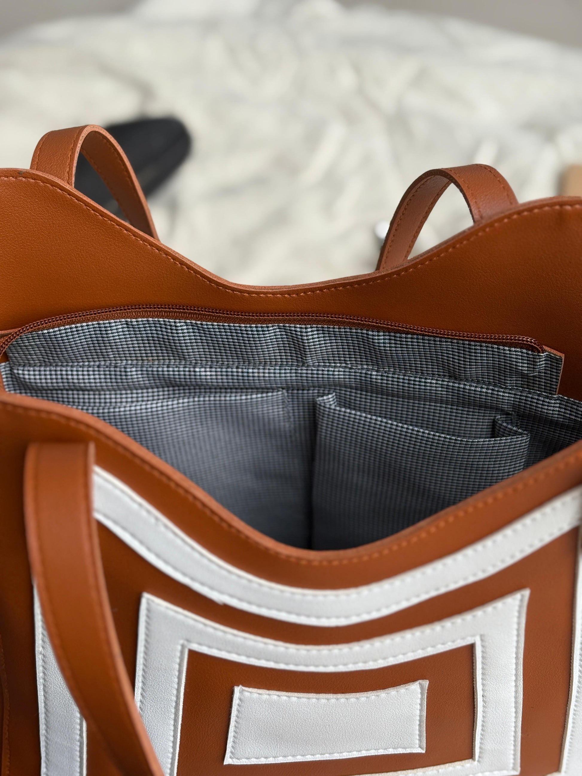 The Urban Maze Mini Tote is a stylish and functional bag designed for everyday use. It features a modern geometric pattern in an elegant tan-white & tan-black combination, making it a statement accessory. Crafted from premium faux leather, this tote is both durable and lightweight.